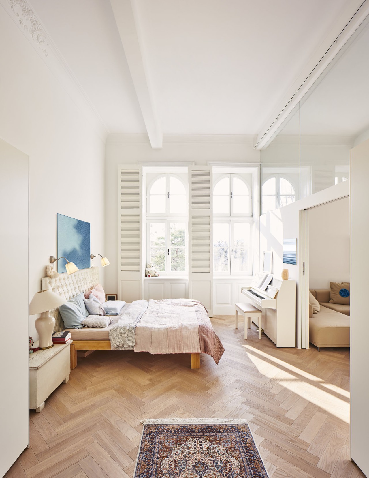 为避免由于实木地板色差过大,给居室的整体美观造成影响,在铺装时进行试铺装,同时在铺装过程中逐步过渡,把颜色接近的实木地板铺到一起,其余可铺到床下、衣柜和沙发下可减轻视觉差。
