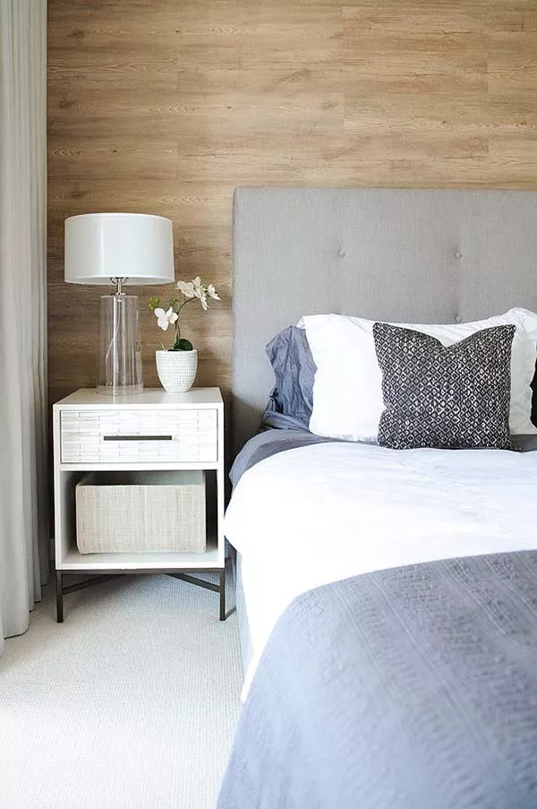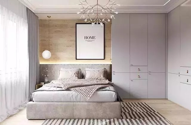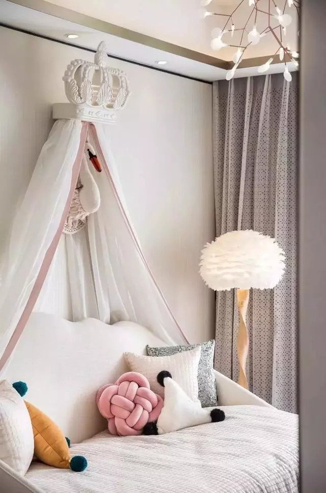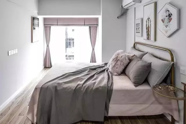 这一款墙壁、沙发、布艺靠枕、床的颜色是淡灰青色,温婉、朦胧气质营造出来,具有少女气质。