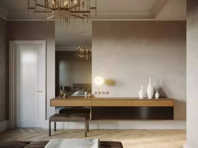 轻奢风格的装饰会运用很多镀烙金属和玻璃素材等,与木地板的结合,展现出低调简单的外表下,折射的贵族气息。同时,通过柔和的软装色系与自然光照,增添一份温馨感。