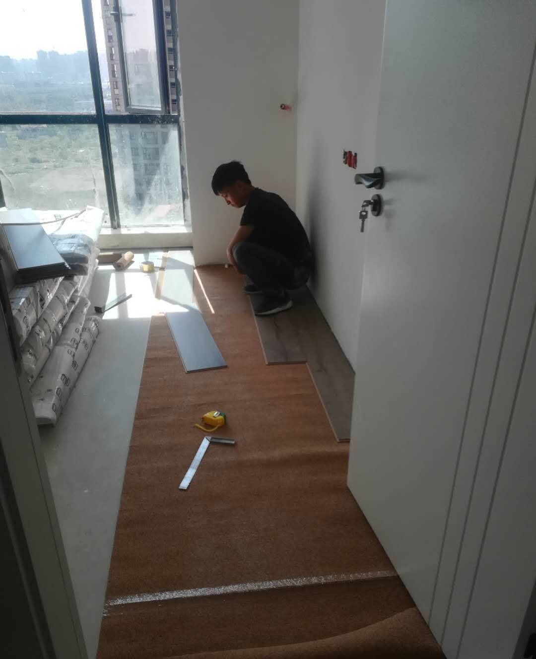 10月10日距离4月装修已经半年了,终于可以上地板了,真是喜极而泣啊!师傅前一天打的电话8点到,由于上班,只能要老妈过去,师傅准时7点50到我们门口,到了房间,哎,由于前一天送的衣柜堆的每个房间都是,给这次铺贴造成了相当的难度!铺装师傅是个很年轻的小伙子,据我妈妈说一天按板子就喝了一口水,还是我妈说你喝口水吧,他才喝的,老妈说必须点赞啊!
